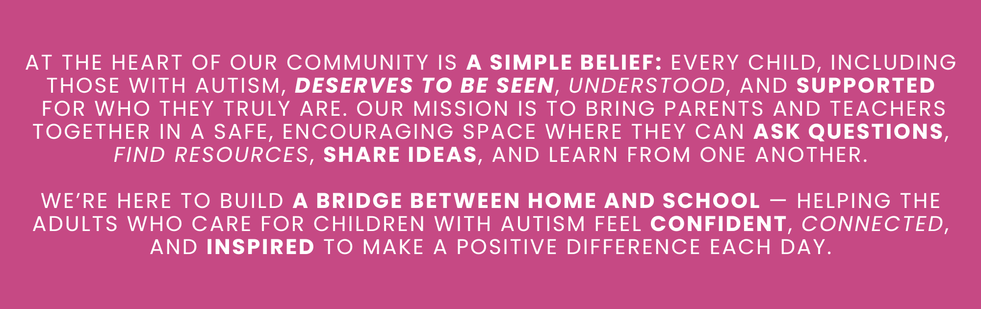 Connecting parents and teachers who support children with autism, offering a safe space to share wins, ask questions, and receive ongoing motivation, practical advice, and reminders that you’re not alone on this journey.
